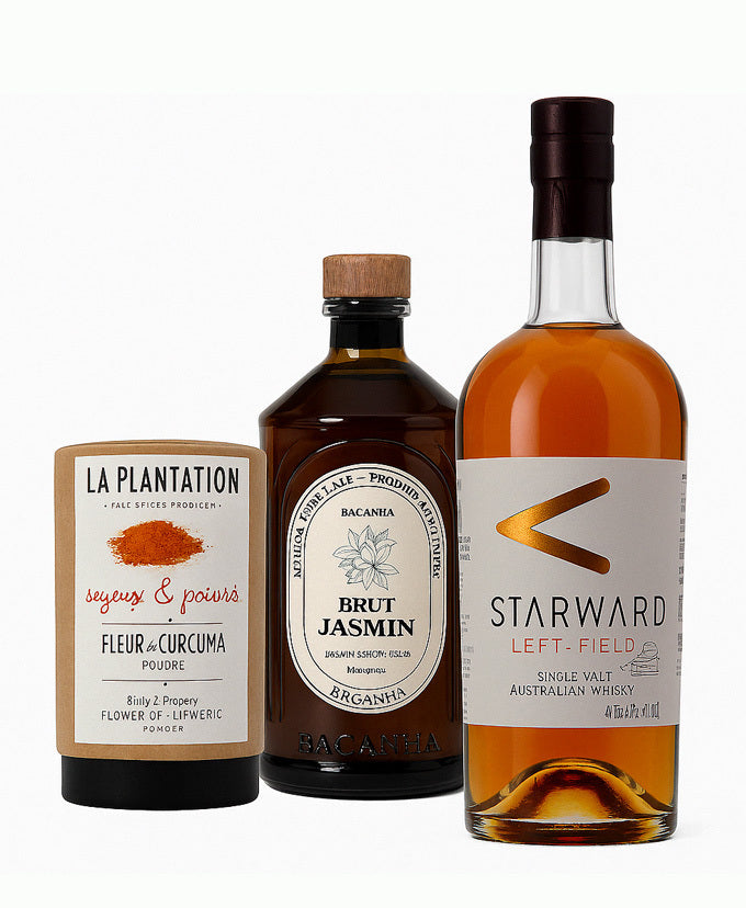 Le point de départ, c’est le Starward Left-Field, un whisky australien généreux, fruité, avec juste ce qu’il faut de chêne. À ça, on ajoute quelques gouttes de sirop de jasmin bio, floral et délicat, puis une pincée de fleur de curcuma, pour le twist d’épice inattendu.